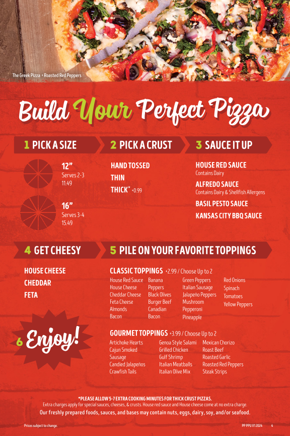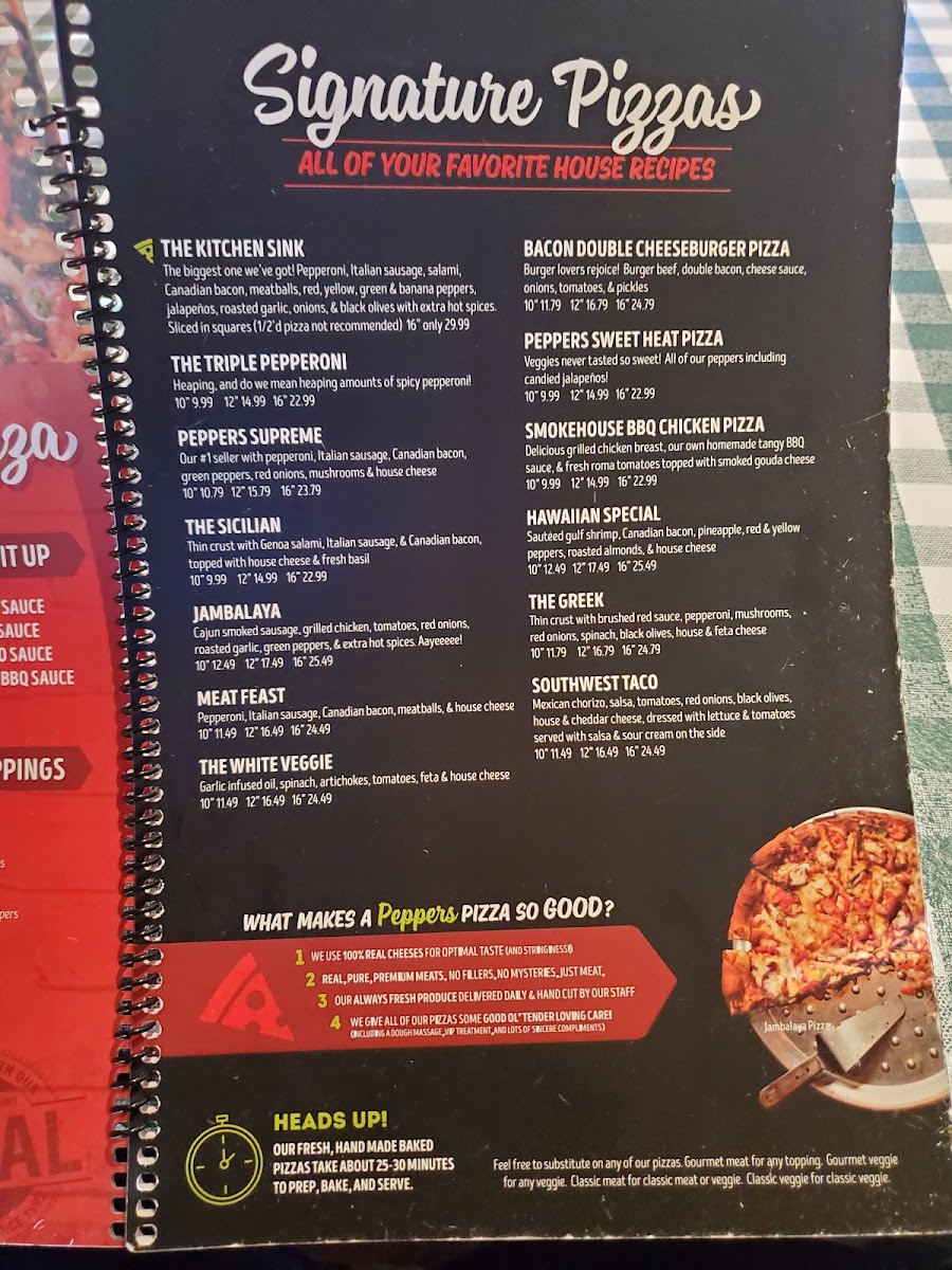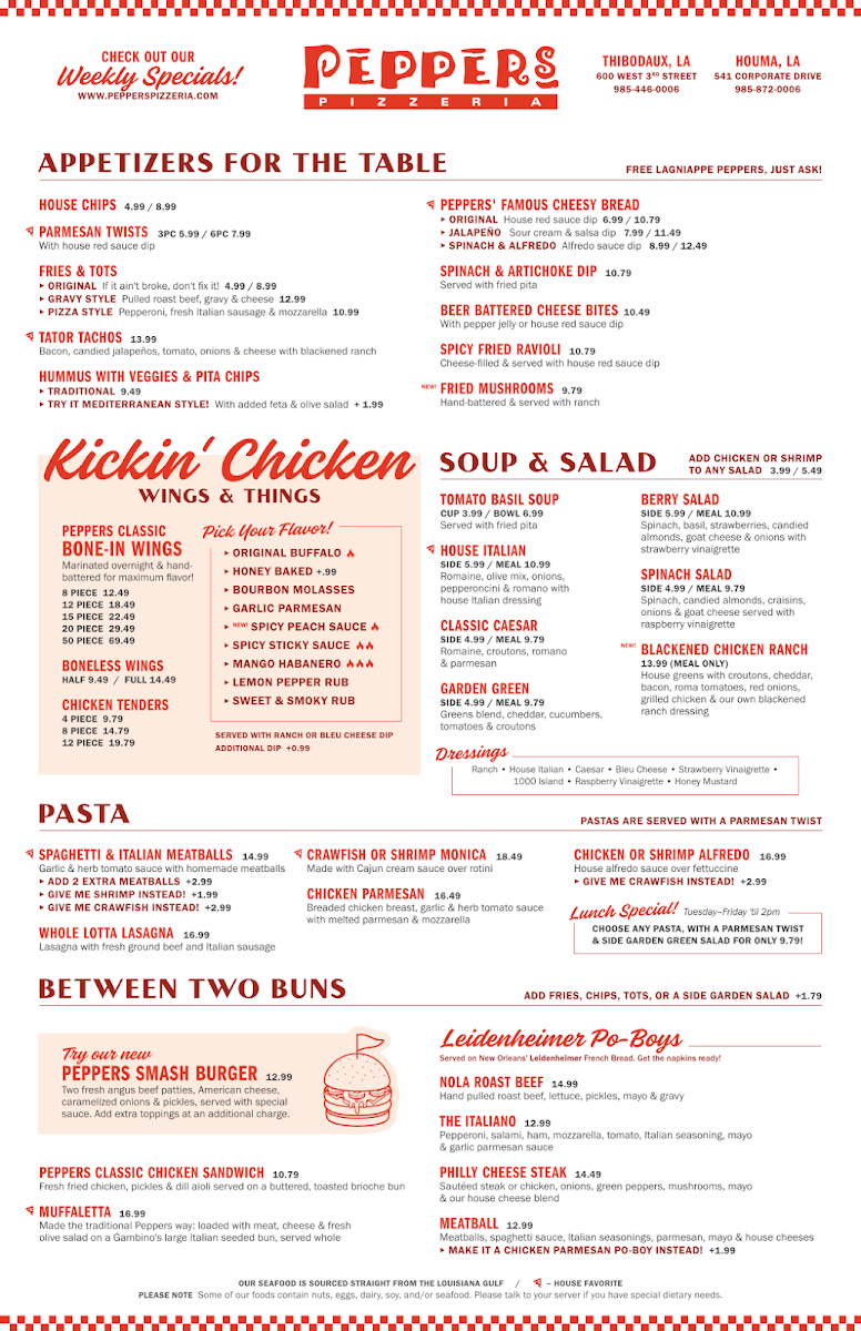 At Peppers Pizzeria Of Houma, every bite is a celebration of fresh ingredients and bold flavors. Located at 541 Corporate Dr, Houma, LA, this cozy pizzeria offers a menu that is sure to satisfy any pizza lover. Whether you're craving a classic margherita, a meaty masterpiece, or a veggie-loaded delight, there's something for everyone. The pizza dough is made fresh daily, topped with perfectly seasoned sauce, and loaded with your favorite toppings. If you're in the mood for something else, try their mouthwatering pastas, crispy salads, or indulgent appetizers. With a laid-back atmosphere and friendly service, Peppers Pizzeria makes it easy to enjoy a hearty meal with family and friends.